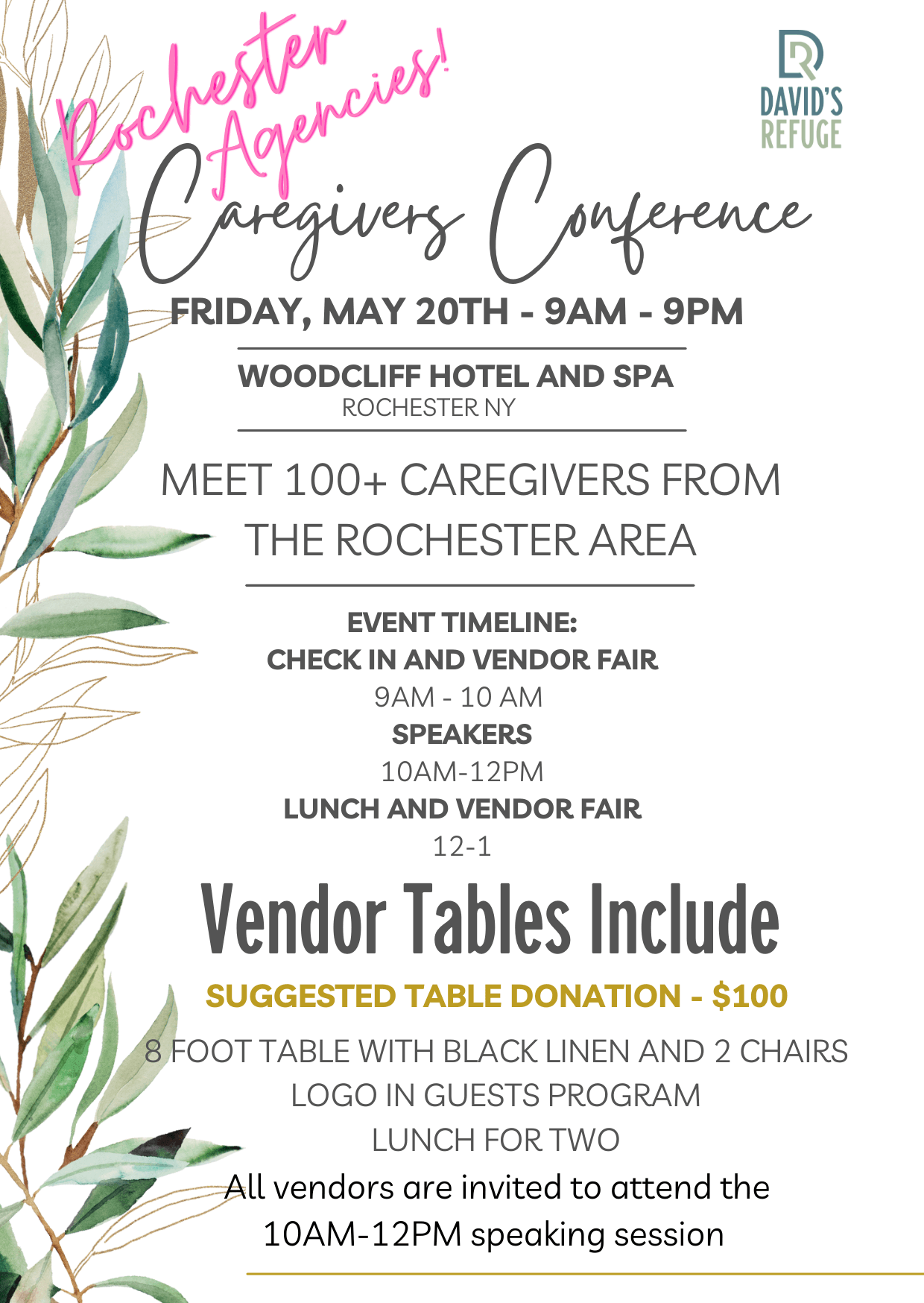David’s Refuge will be hosting their annual Caregivers Conference in Rochester, NY for 100 caregivers in the Greater Rochester and Buffalo Community.