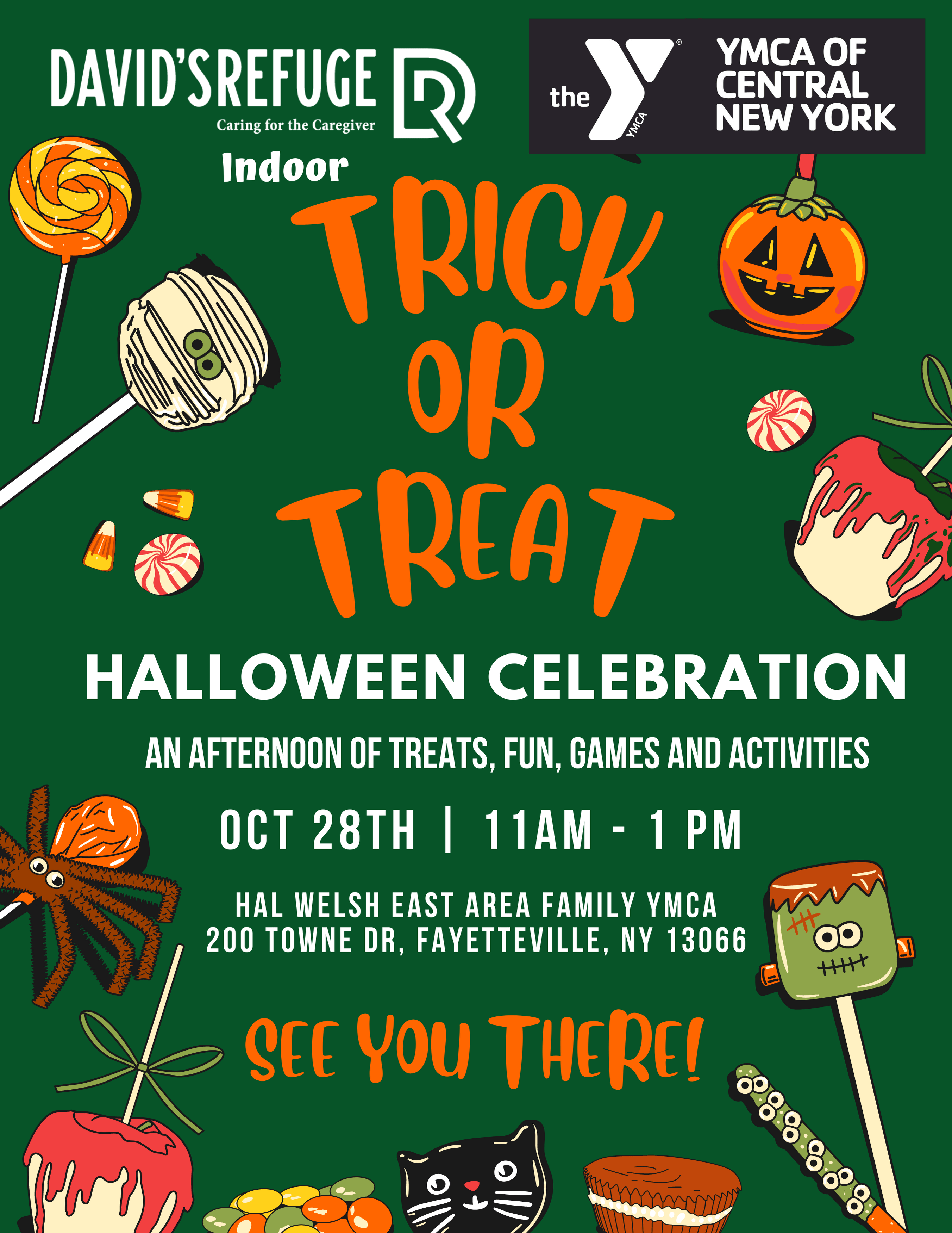 Join us for a Not So Spooky Halloween event! On October 28th from 11-1pm we will be hosting our annual Trick or Treat Halloween Celebration inside Hal Welsh East Area Family YMCA in Fayetteville!