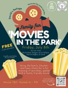 Bring the whole family out to Burnet Park on July 8th for family fun, activities and a movie!!