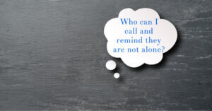 Think of it this way. If I made a commitment to call one person each day it wouldn’t take very long for everyone to get a phone call. Here is how it would work. On day one I call one person. On day two I, and the person I called yesterday, call one person. That’s two people being reminded they are loved and are not alone. If each person who gets a phone call will continue to call one person the next day, by day 20 one million, forty-eight thousand, five hundred and seventy-six people (1,048,576) will have been reminded they are not alone and loved. Do you want to join me? Lets do it!